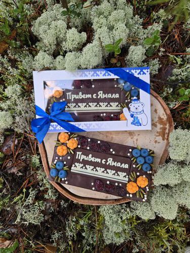 Если вам вдруг понадобился идеальный сувенир с Ямала, то шоколад "Привет с Ямала" — это то, что нужно! Этот темный (не горький!) премиальный шоколад не только радует глаз, но и вкусом! Он украшен аппетитной морошкой и голубикой из шоколада, которые добавляют ему особую изюминку. А внутри прячутся кедровые орешки и вяленая клюква, которые придают невероятную текстуру и насыщенность. Такой подарок точно порадует любого, кто ценит настоящие северные лакомства. Убедитесь сами: с шоколадом "Привет с Ямала" вы всегда приедете с чем-то особенным!