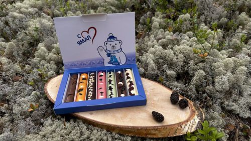 Шоколад "Ненец" представляет собой уникальный продукт, выполненный из темного ( не горький!) и белого премиального шоколада и имеющий форму ненца-жителя Ямала. Этот изысканный десерт отличается высококачественными ингредиентами, что обеспечивает ему нежный и насыщенный вкус. Особенностью дизайна является этнический акцент: ненец одет в национальную одежду, украшенную традиционным орнаментом Ямала, что придаёт изделию уникальность и оригинальность. А северные шоколадные ягодки в виде морошки и черники приведут в восторг не только детей , но и взрослых.
